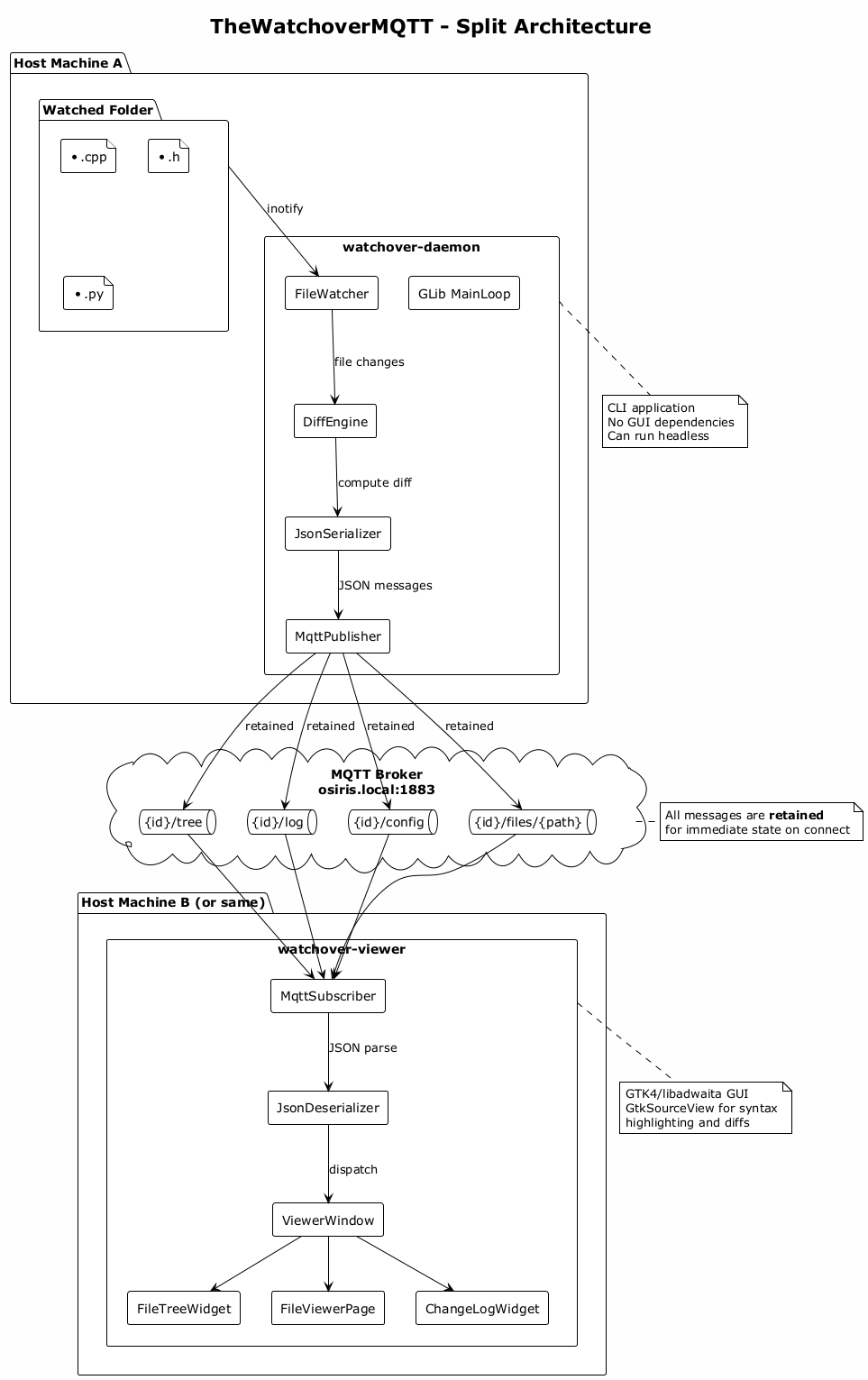 CLI daemon (publisher) monitors files and publishes changes; GTK4 viewer (subscriber) displays them. They communicate through any standard MQTT broker.